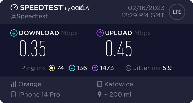 Najbardziej irytujący jest ten lejek, który występuje u wielu partnerów roamingowych. Jest to widoczne bardzo wyraźnie, gdy robiłem speedtesta przy pełnym zasięgu, blisko nadajnika. Dla mnie to robienie z klientów idiotów, bo prędkość na poziomie 0,3 Mbit to w praktyce właściwie brak Internetu.