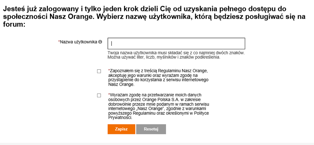 Klikamy dalej i jesteśmy w Nasz Orange 🙂 Już tylko krok dzieli nas od możliwości pisania, lajkowania i aktywnego udziału w życiu Społeczności. Ten krok, to ustalenie nazwy pod jaką będziemy występować na forum oraz akceptacja regulaminu.