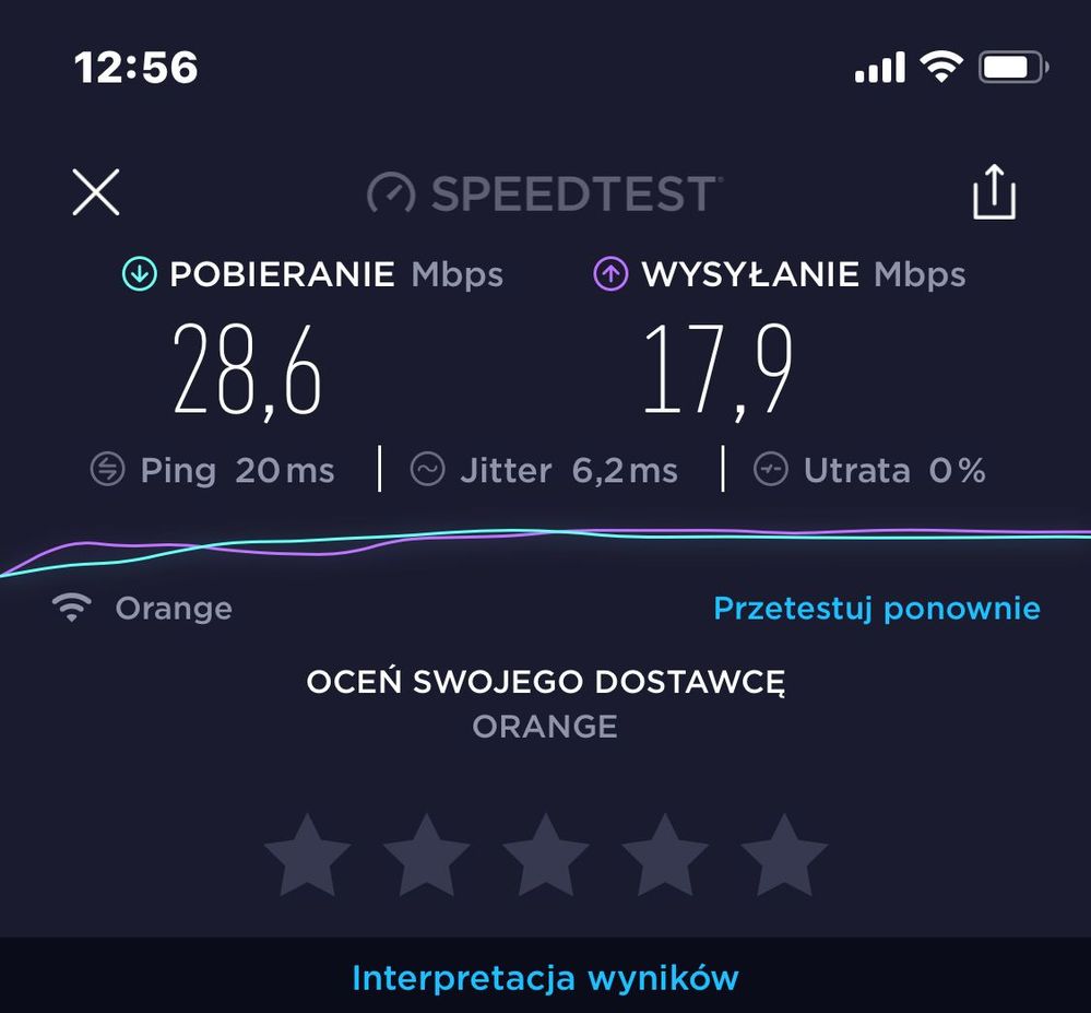 Tak działa wszędzie szybkość pobierania 20-40 wysyłania 10-25 w zależności oczywiście od pory dnia ale nie schodzi poniżej tych wartości