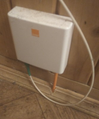 Tak wygląda gniazdko: pomarańczowy światłowód wchodzi z zewnątrz, biały wychodzi z gniazdka i wchodzi do FB opodal. To coś zupełnie innego niż gniazdko telefoniczne. Przede wszystkim jest znacznie większe.