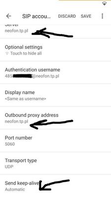 Ustawienia domyślne konta SIP wymagają modyfikacji w kilku miejscach. W szczególności istotne są zaznaczone strzałkami pozycje określające: