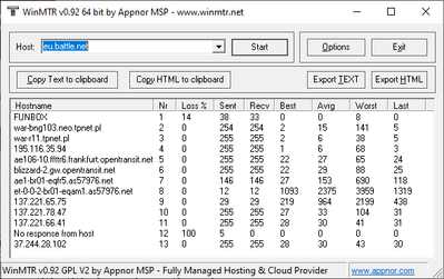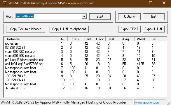 Skoki pingów występują na tej trasie również w Orange - nie ma jednak utraty pakietów - chociaż przypuszczam, że to dlatego, że jest godzina prawie 15 w niedzielę 🙂 Wczoraj mogłem sprawdzić właściwie. Ogółem Battle.net ma problemy u większości dostawców na pewnych węzłach - kwestia routowania pakietów do nich.