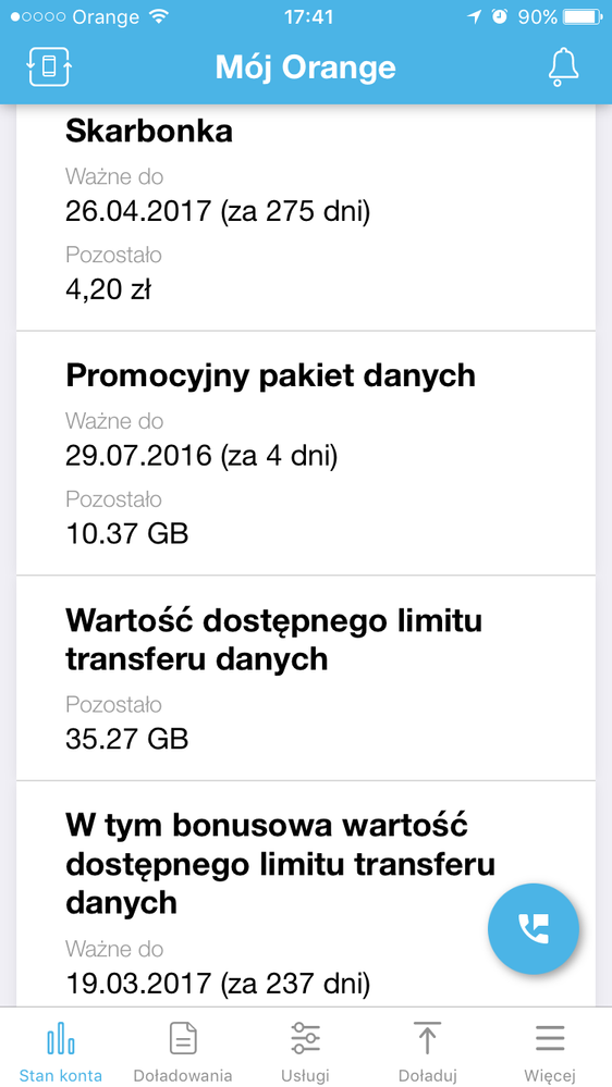 Teraz spójrzymy na pakiet bonusowy 35,27 GB. Jest w trzech miejscach. Wiadomo, że to bonus za doładowania. Czy nie może być tylko pod tą jedną etykietą, skoro i tak pokazuje się oddzielnie i nie zlicza razem 8 GB z pakietu i 10 GB z promocji? Mniej ogarnięci się zgubią. A tak jest jeszcze jako pakiet danych i limit transferu danych.
