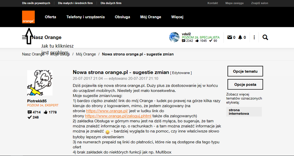 1) bardzo ciężko znaleźć link do mój Orange - ludek po prawej na górze kilka razy kieruje do strony z logowaniem, mimo, że jestem zalogowany (na stronie https://www.orange.pl/ jest w ludku link do strony https://www.orange.pl/zaloguj.phtml także dla zalogowanych)