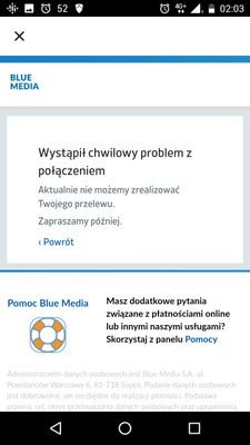 Czy był kontakt w tej sprawie z BlueMedia i/lub Orange, jak podałem w swoim pierwszym poście? Przyczyn może być wiele, nie koniecznie po stronie banku, ale również po stronie BlueMedia. Przerwa techniczna, awaria, blokada dziwnych transakcji itp.
