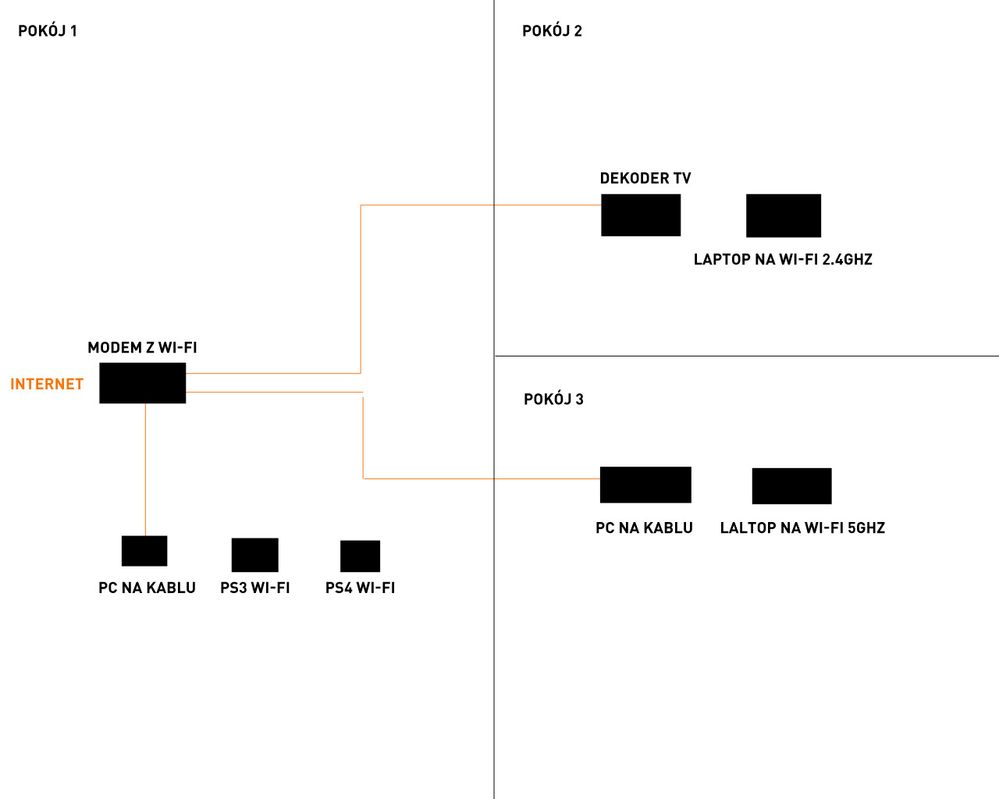 mam problem z zwiększeniem transferu na sieci Wi-Fi. Poniżej rozrysowana wersja sieci domowej. Pomarańczowe linie to kabel sieciowy.