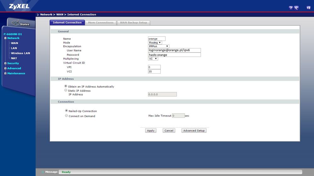 Problem nie został rozwiązany. Router poszedł do reklamacji, odesłali mi nowy, ale absolutnie nic się nie zmieniło. Może tylko to, że po zmianie hasła  do internetu na stronie orange.pl internet działał jeszcze ponad 24h po czym się wyłączył i żadne hasło nie pasuje. Obecnie mam dwa routery, żaden z nich nie łączy sie z internetem. Resetowanie do ustawień fabrycznych nie przynosi rezultatu. Wrzucam screen z ustawień. Dodawanie /ipv6 lub wpisywanie bez niego nie przynosi żadnej róznicy.