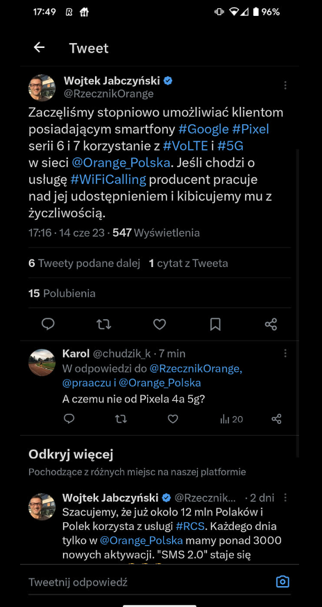 Tak więc nie usuwajmy tematów o dodaniu Pixeli do puli telefonów obsługujących 5G w Orange do czasu, aż faktycznie zacznie ono działa dla wszystkich modeli 😉