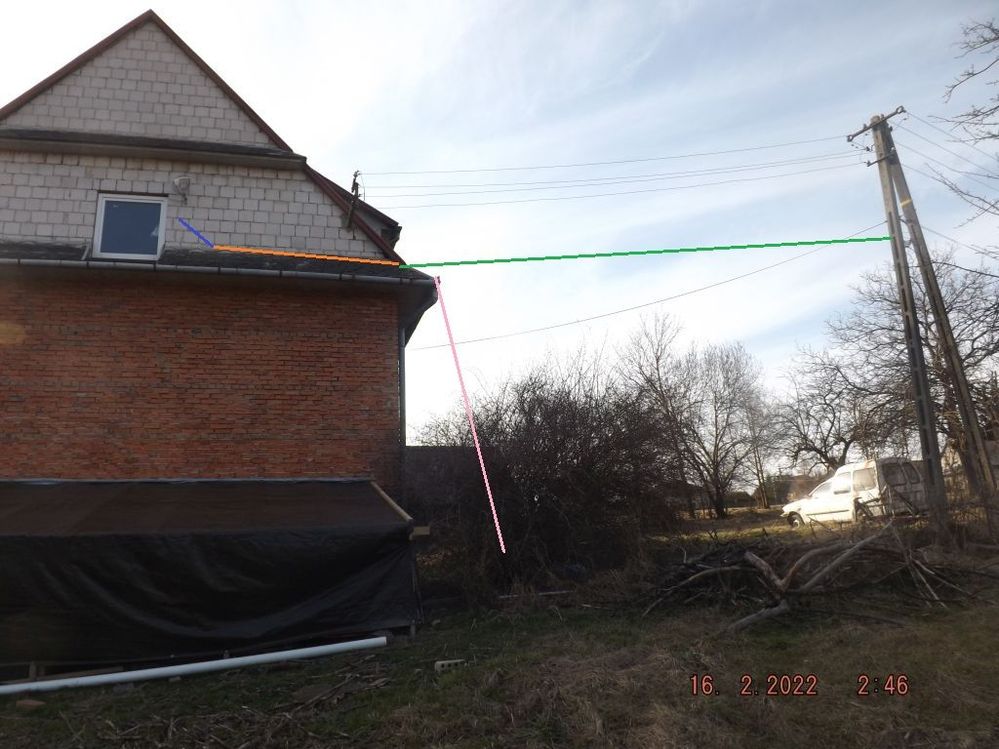 różowe to drabina. zielone to światłowód idzie do rogu przy rynnie. technik wychodzi po drabinie powinien bez problemu dosięgnąć jak ze słupa przerzuci . potem wzdłuż rynny po tej szarej cegle jak te pomarańczowe co narysowałem a potem hak w tym niebieskim miejscu ewentualnie może być i nawet dalej hak jeśli w tym miejscu z jakiegoś powodu nie może być.. Co do faktu to wiem, że to zależy od techników/monterów czy im się będzie chciało czy powiedzą, że nie da się i będą chcieli jak najkrótszą drogą. Nie mniej jeśli chciałoby się im to czy to rozwiązanie co piszę jest możliwe do zrealizowania?