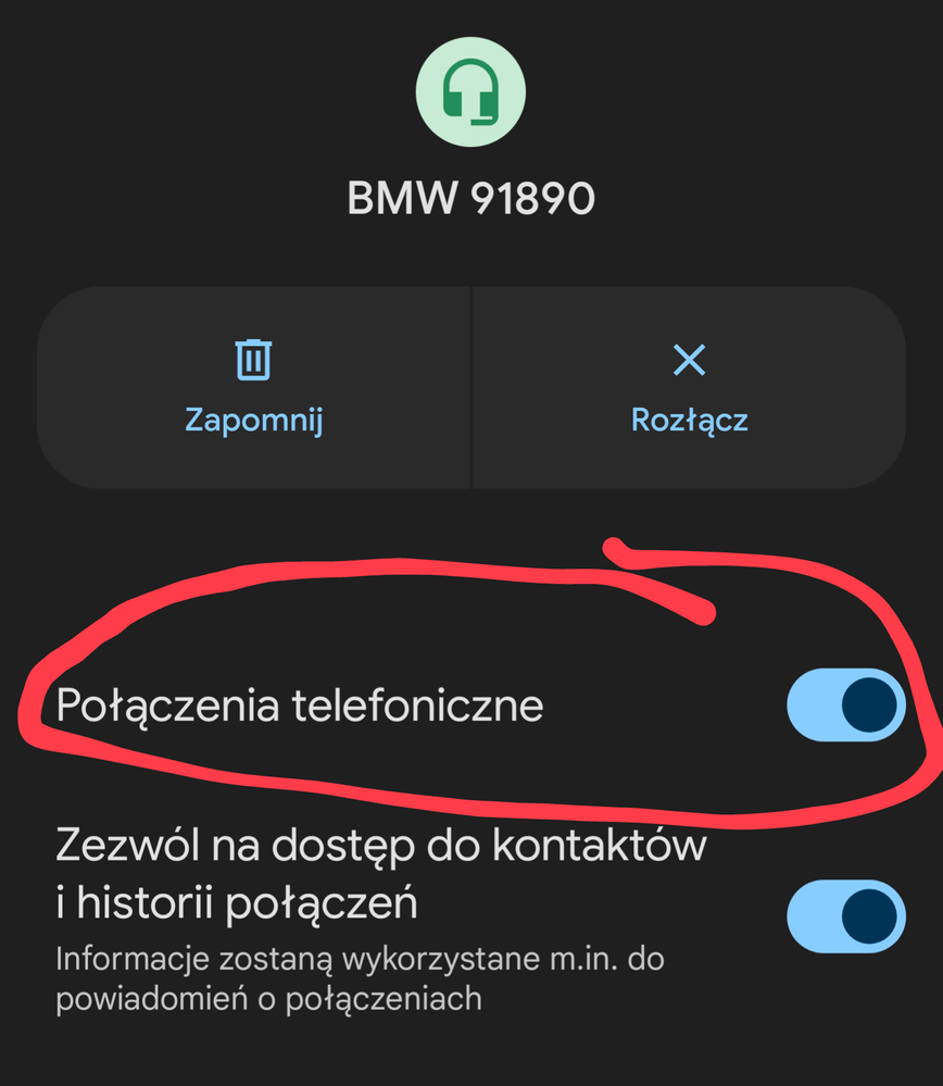 Ustawienia > Połączenia > Bluetooth – kliknij ikonę koła zębatego przy połączonym urządzeniu i upewnij się, że wszystkie opcje są zaznaczone.