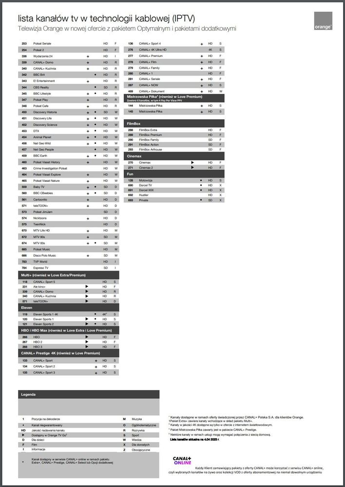 Po wpisaniu w Google Chrome "lista kanałów tv w technologii kablowej (IPTV)", jednym z wyszukanych elementów jest taka strona: ( https://orange.binaries.pl/bw/20155/0/57691/af4bcc93-7b99-4c9b-93ed-3f4bcaae6248.pdf ) Jest to cyt. lista kanałów tv w technologii kablowej (IPTV); Telewizja Orange w nowej ofercie z pakietem Optymalnym i pakietami dodatkowym. Nie wiem tylko czy poprawki np. dublujące się kanały są również w takim zestawieniu. Niemiej bardzo dobrze ze chociaż Canal + przekazuje swoim klientom co jakiś czas ujednolicane zestawiania dostępnych kanałów. (aktualne na 04-04-2023)